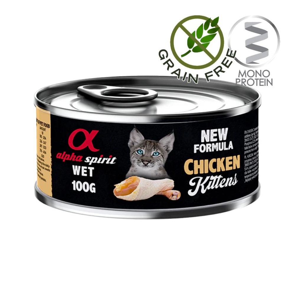 Консервата Alpha Spirit Complete Kitten Wet Chicken е най-доброто, което можете да сложите в паничката на малкото коте. Новата още по-добра рецепта е приготвена с висококачествени съставки и таурин гарантиращи оптимална комбинация за балансирана, здравословна и вкусна диета.