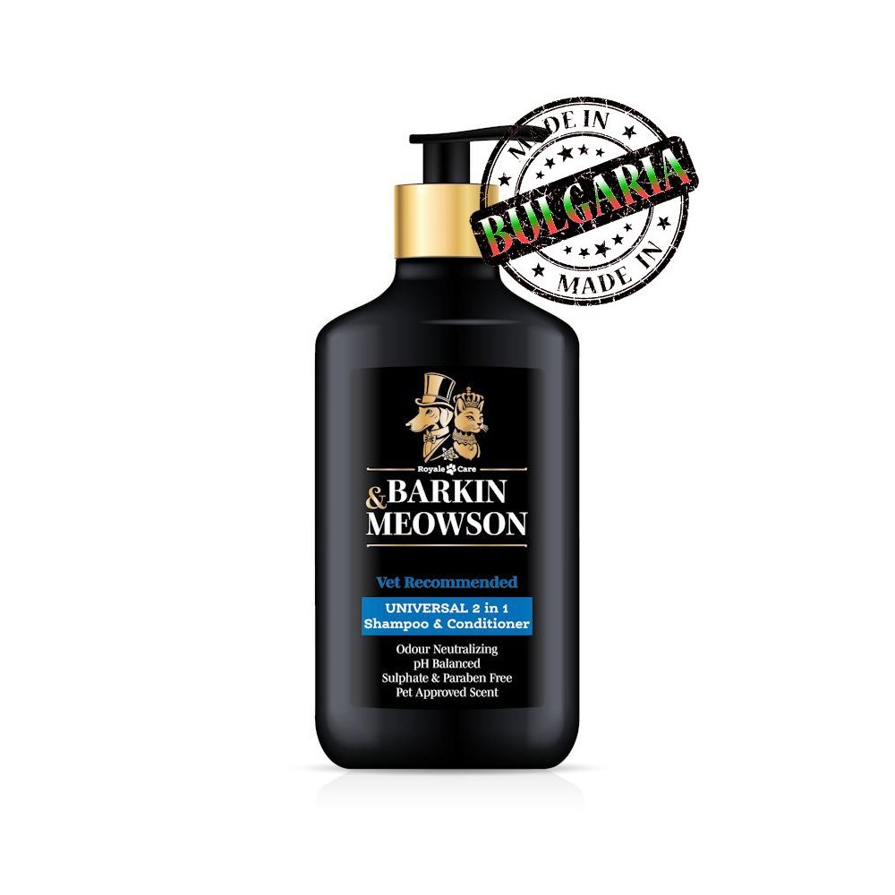 Barkin & Meowson Universal 2 in 1 Shampoo & Conditioner шампоан и кондиционер в едно. Той е със специална формула с масло от пшенични зародиши и витамин PP за дълбока хидратация и за по-здрава, блестяща и лесна за разресване козина. С ненатрапчив аромат одобрен от Лорд Баркин и Лейди Мяусън, за да не дразни чувствителното обоняние на домашните любимци, като същевременно ефикасно елиминира неприятните миризми. Балансирано pH. Без сулфати и парабени. Препоръчан от ветеринари.