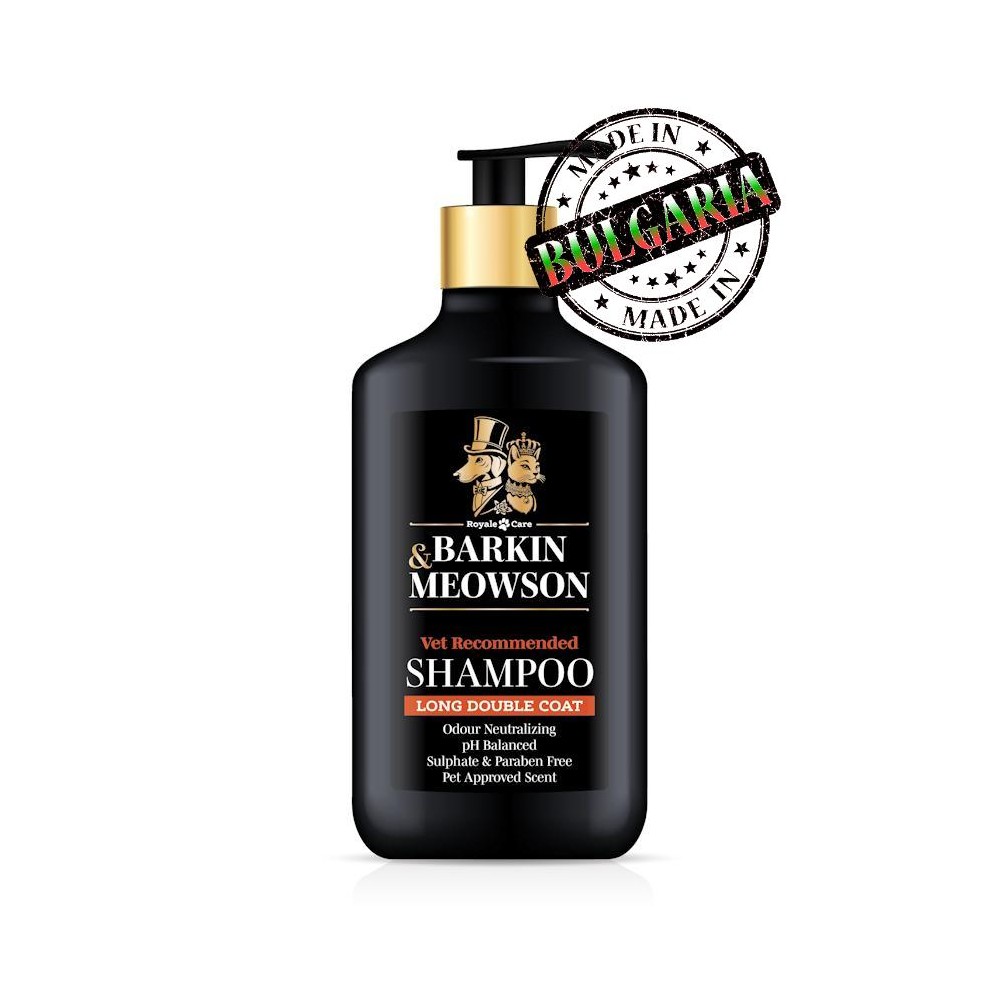 Шампоанът Barkin & Meowson Long Double Coat е "аристократична" грижа специално за кучета с дълъг косъм с подкосъм като голдън ретривър, австралийска овчарка, корги, немска овчарка, померан, хъски и др. Благодарение на формулата с кератин и копринен протеин, осигурява аристократична грижа за кралско излъчване. Те правят козината по-здрава и лъскава, а включеният витамин PP почиства в дълбочина като по този начин намалява скубането на изящната козина. С ненатрапчив аромат, който не дразни чувствителното обоняние на кучетата. Ефикасно елиминира неприятните миризми. Балансирано pH. Без сулфати и парабени. Препоръчан от ветеринари.