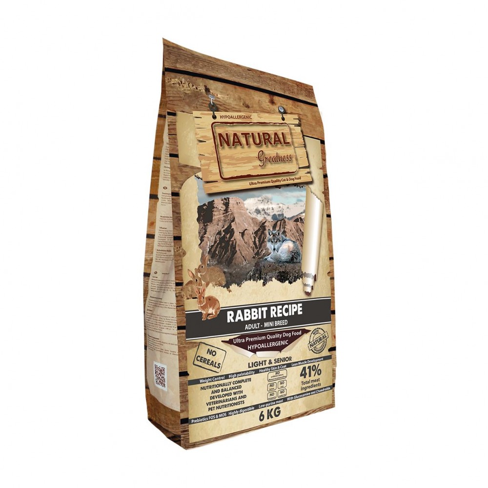 Natural Greatness "Rabbit Recipe" е хипоалергенна храна подходяща за навършили пенсионна възраст кучета от най-малките породи. . Подходяща и за кастрирани и склонни към напълняване кучета пак от същите дребни породи.