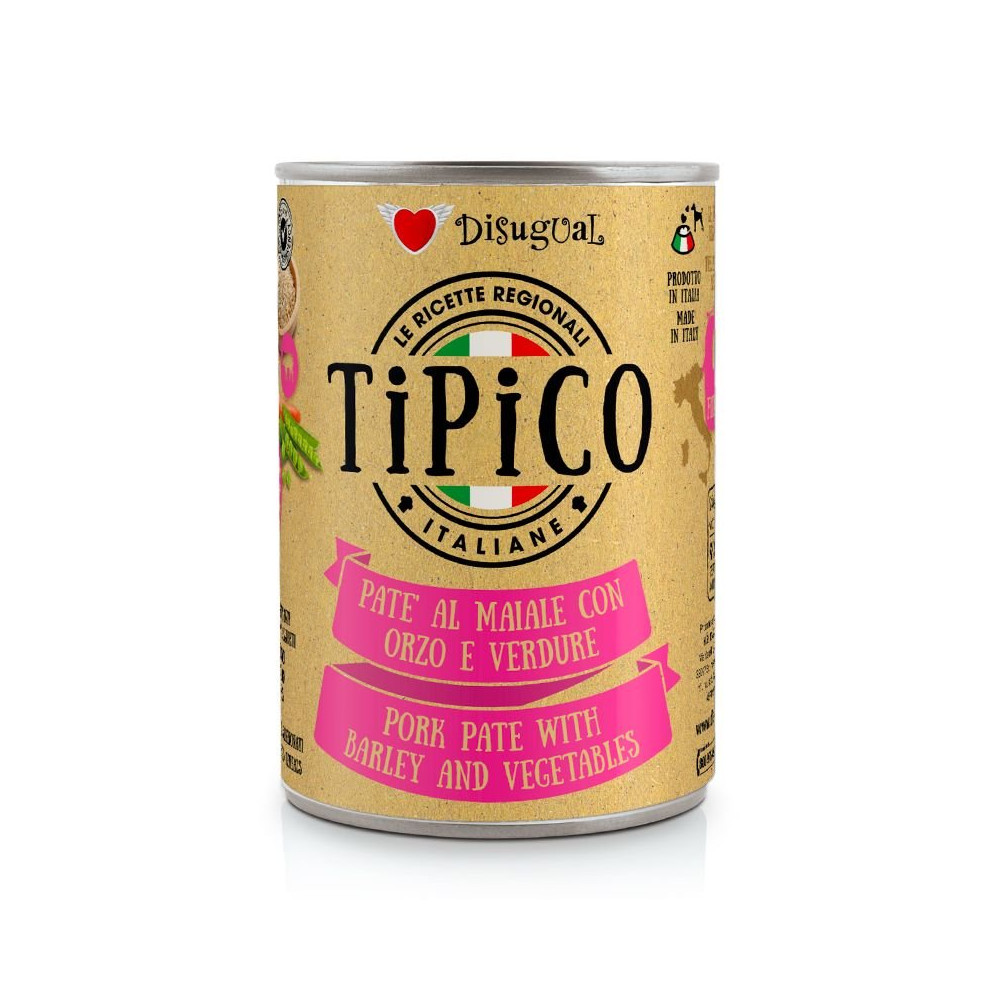 Disugual Tipico е пълноценна храна със свинско, ечемик и зеленчуци предназначена за отраснали кучета от всички породи с нормална активност.
