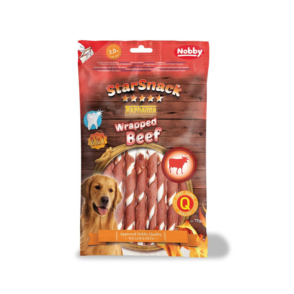 StarSnack BBQ Wrapped Beef е допълваща храна за кучета. Рецептата само с натурални продукти е предпоставка за неустоим вкус, а минималното съдържание на мазнини (само 3%) позволява лакомството да се дава няколко пъти дневно. Отлична награда при обучение за добре свършена работа.