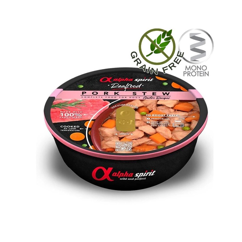 Alpha Spirit Realfood Pork Stew e пълноценна и натурална храна предназначена да задоволи и най-взискателните вкусове. Формулата с 97% прясно свинско месо в собствен сос и зеленчуци предлага несравнимо кулинарно изживяване. Пълноценно и балансирано хранене, което в същото време доставя всички основни хранителни вещества за здравето и жизнеността на вашето куче. Приготвянето на ниска температура и висококачествените съставки гарантират лесно и здравословно храносмилане. Обогатена с витамини A, D3 и E, както и основни минерали за оптимално здраве.