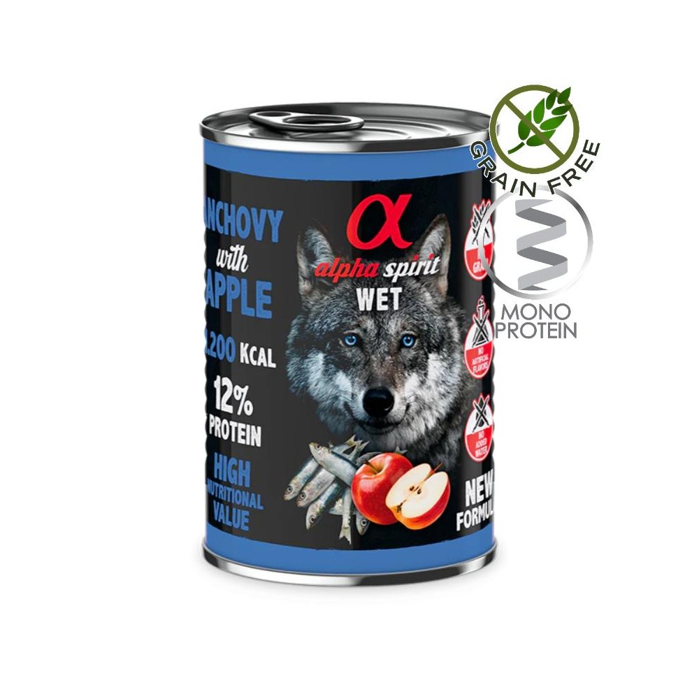 Консервата Alpha Spirit Complete Dog Wet Anchovy with Apple е най-доброто, което можете да сложите в паничката на вашия най-добър приятел. Новата още по-добра рецепта е приготвена с висококачествени съставки гарантиращи балансирана, здравословна и най-вече вкусна, вкусна диета.