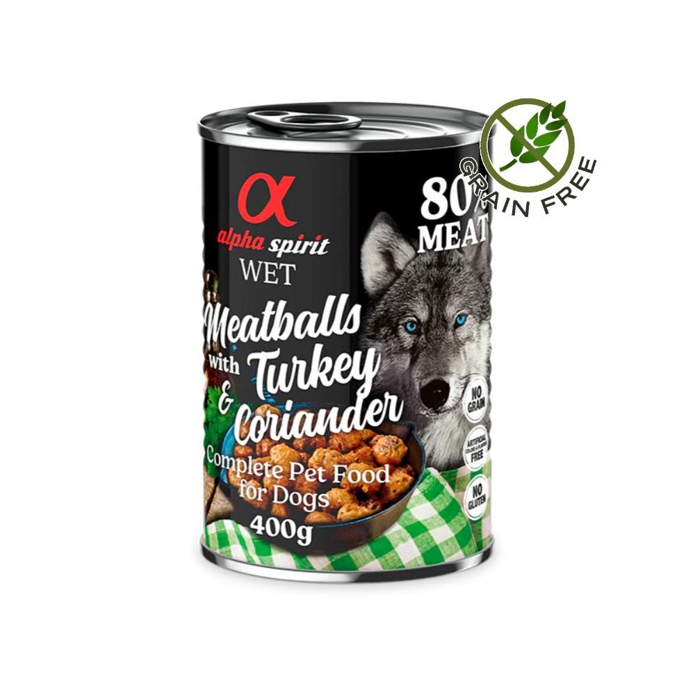 Консервата Alpha Spirit Dog Wed Meatballs Turkey & Coriander е изключително вкусна храна с 80% месо и перфектен микс от плодове, зеленчуци и подправки! Тя е най-доброто, което можете да сложите в паничката на вашия най-добър четириног приятел.