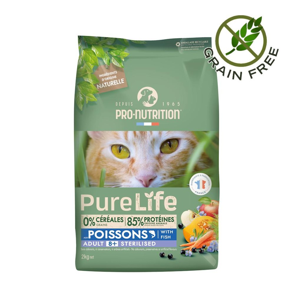 Дехидратирани животински протеини 32% (пиле, пуйка, свинско). Фибри от бакла*. Картофено нишесте. Грахово нишесте. Животински мазнини (патица, домашни птици ). Грах*. Дехидратирана риба (4%). Фибри от ябълка*. Ленено семе*. Хидролизати на животински протеини. Сладък картоф*. Калциев сулфат. Бирена мая. Артишок*. Рибни автолизати* (0,5%). Рибено масло (0,5%). Калциев карбонат. Дехидратирани моркови*. Копър*. Фруктоолигозахариди. Водорасли*. Калиев хлорид. Пептиди с морски произход (хидролизиран колаген тип II) (0,06%). Тиква*. Червена боровинка*. Касис*. Нар*. Екстракти от мая (Saccharomyces cerevisiae, Cyberlindnera jadinii). Юка*. Ацерола*. Морски зърнастец*. Боровинки*. Пъпеш*.