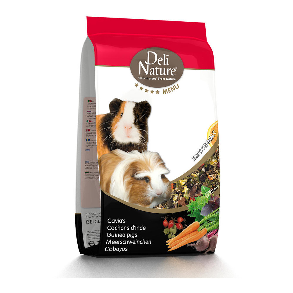 Храната Deli Nature 5 Star Menu представлява изключително разнообразна и балансирана смес, съдържаща повече от 20 естествени съставки, с високо ниво на витамин С (495 mg / kg). Миксът е перфектен за хранителните нужди на вашето "прасенце".