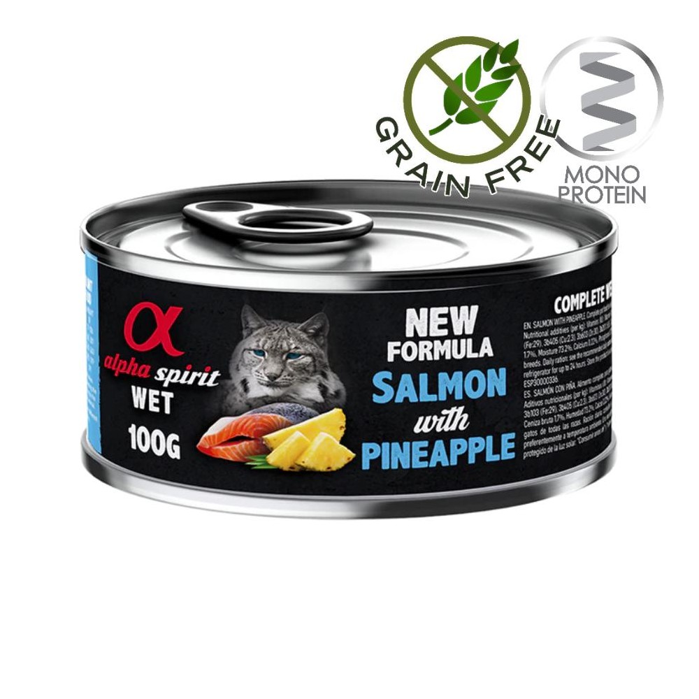 Консервата Alpha Spirit Complete Cat Wet Salmon with Pineapple е най-доброто, което можете да сложите в паничката на вашата писана. Новата още по-добра рецепта е приготвена с висококачествени съставки и таурин гарантиращи оптимална комбинация за балансирана, здравословна и вкусна диета.