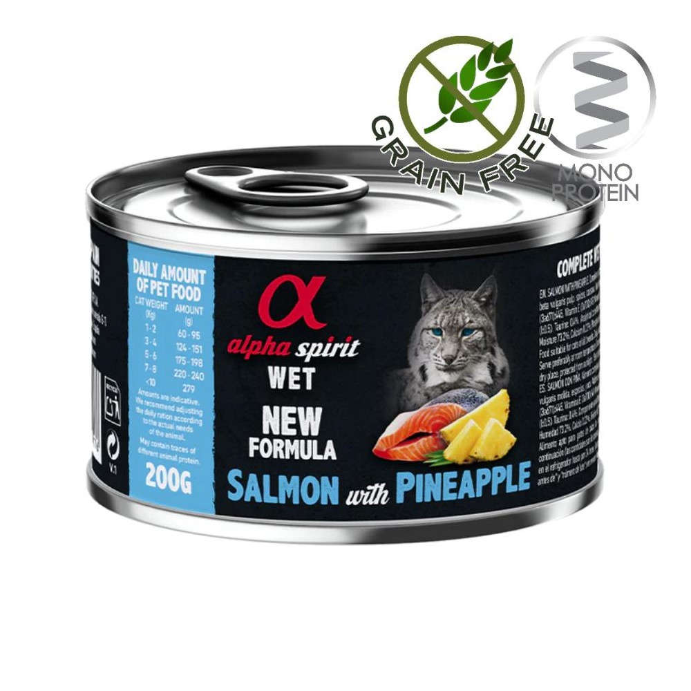 Консервата Alpha Spirit Complete Cat Wet Salmon with Pineapple е най-доброто, което можете да сложите в паничката на вашата писана. Новата още по-добра рецепта е приготвена с висококачествени съставки и таурин гарантиращи оптимална комбинация за балансирана, здравословна и вкусна диета.
