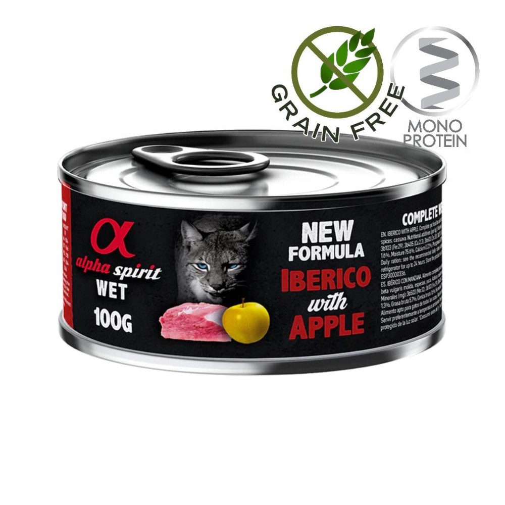 Консервата Alpha Spirit Complete Cat Wet Iberico with Apple е най-доброто, което можете да сложите в паничката на вашата писана. Новата още по-добра рецепта е приготвена с висококачествени съставки и таурин гарантиращи оптимална комбинация за балансирана, здравословна и вкусна диета.
