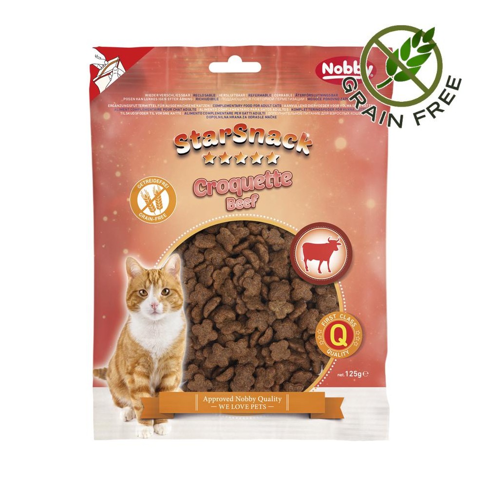 StarSnack Croquette Beefs са едно чудесно лакомство за всички котки. Хрупкавите крокети са изготвени от изцяло натурални продукти, с таурин и витамини за добро общо здравословно състояние. В рецептата няма зърнени храни, което ги прави особено подходящи за котки с глутенова непоносимост. С FOS за здравословно функциониране на стомашно-чревния тракт. С екстракт от юка за елиминиране на неприятните миризми "на изхода".