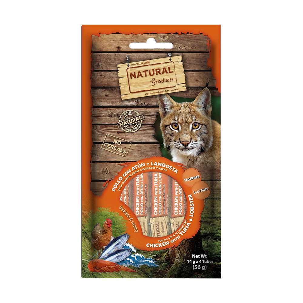 Natural Greatness Chicken with Tuna & Lobster е хипоалергенна кремообразна мека закуска, приготвена без зърнени култури от първокласно годно за употреба от човека пилешко месо. Лакомството е обогатено таурин и L-лизин (есенциална аминокиселина) насърчаваща правилното функциониране на имунната система на котката.